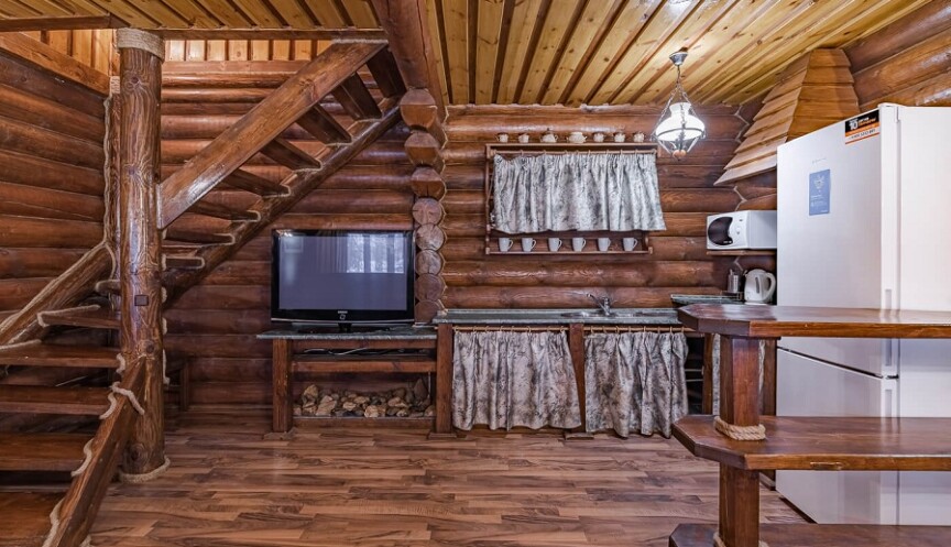 - На 1-ом этаже располагается открытая веранда с мебелью, санузел: душевая кабина, унитаз, раковина, фен; гостиная: мягкая мебель, большой обеденный стол со стульями, барная стойка, плита, посуда, холодильник, СВЧ, ЖК-телевизор.